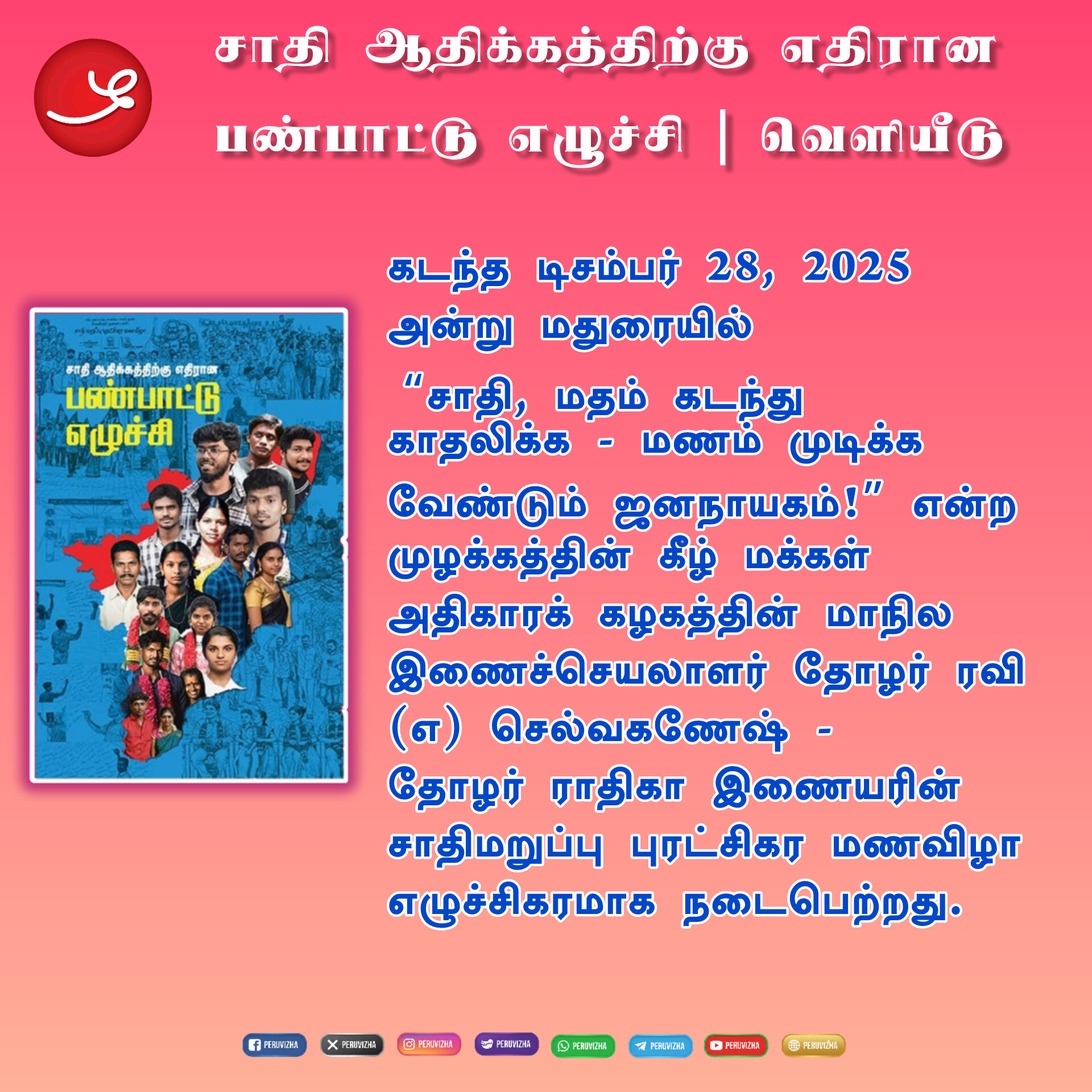 கடந்த டிசம்பர் 28, 2025 அன்று மதுரையில் “சாதி, மதம் கடந்து காதலிக்க – மணம் முடிக்க வேண்டும் ஜனநாயகம்!” என்ற முழக்கத்தின் கீழ் மக்கள் அதிகாரக் கழகத்தின் மாநில இணைச்செயலாளர் தோழர் ரவி (எ) செல்வகணேஷ் – தோழர் ராதிகா இணையரின் சாதி மறுப்பு புரட்சிகர மணவிழா எழுச்சிகரமாக நடைபெற்றது. இம்மணவிழாவானது, சாதி ஆதிக்கத்திற்கு எதிராக தலித் மக்களிடையே ஏற்பட்டுவரும் பண்பாட்டு எழுச்சிக்கு முகங்கொடுப்பதாகவும், சாதி ஆணவப் படுகொலைகளுக்கு எதிரான பண்பாட்டு போர் முழக்கத்தின் பிரகடனமாகவும் அமைந்தது.