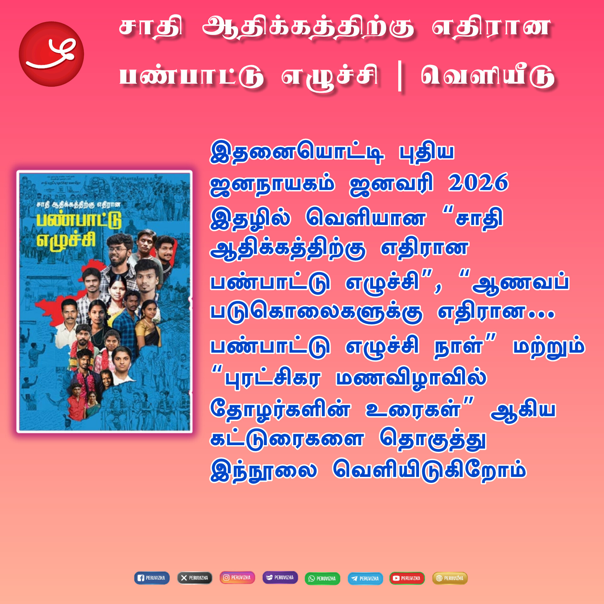 இதனையொட்டி புதிய ஜனநாயகம் ஜனவரி 2026 இதழில் வெளியான “சாதி ஆதிக்கத்திற்கு எதிரான பண்பாட்டு எழுச்சி”, “ஆணவப் படுகொலைகளுக்கு எதிரான… பண்பாட்டு எழுச்சி நாள்” மற்றும் “புரட்சிகர மணவிழாவில் தோழர்களின் உரைகள்” ஆகிய கட்டுரைகளை தொகுத்து இந்நூலை வெளியிடுகிறோம்.