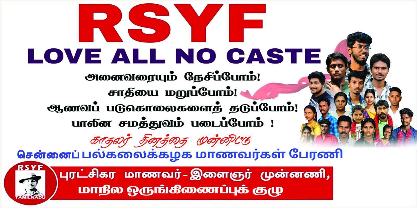 அனைவரையும் நேசிப்போம்! சாதியை மறுப்போம்! ஆணவப்படுகொலை தடுப்போம்! பாலின சமத்துவம் படைப்போம்! என்கிற முழக்கத்தோடு காதலர் தினத்தை முன்னிட்டு புரட்சிகர மாணவர் இளைஞர் முன்னணி சார்பாக மாணவர் பேரணி நடைபெறவுள்ளது.