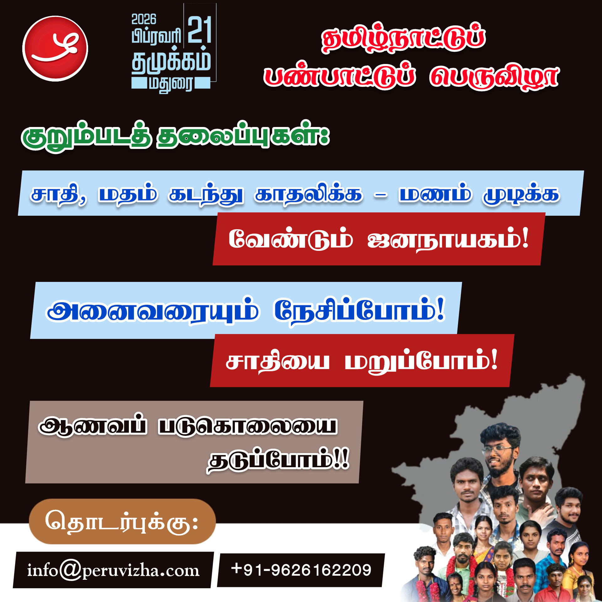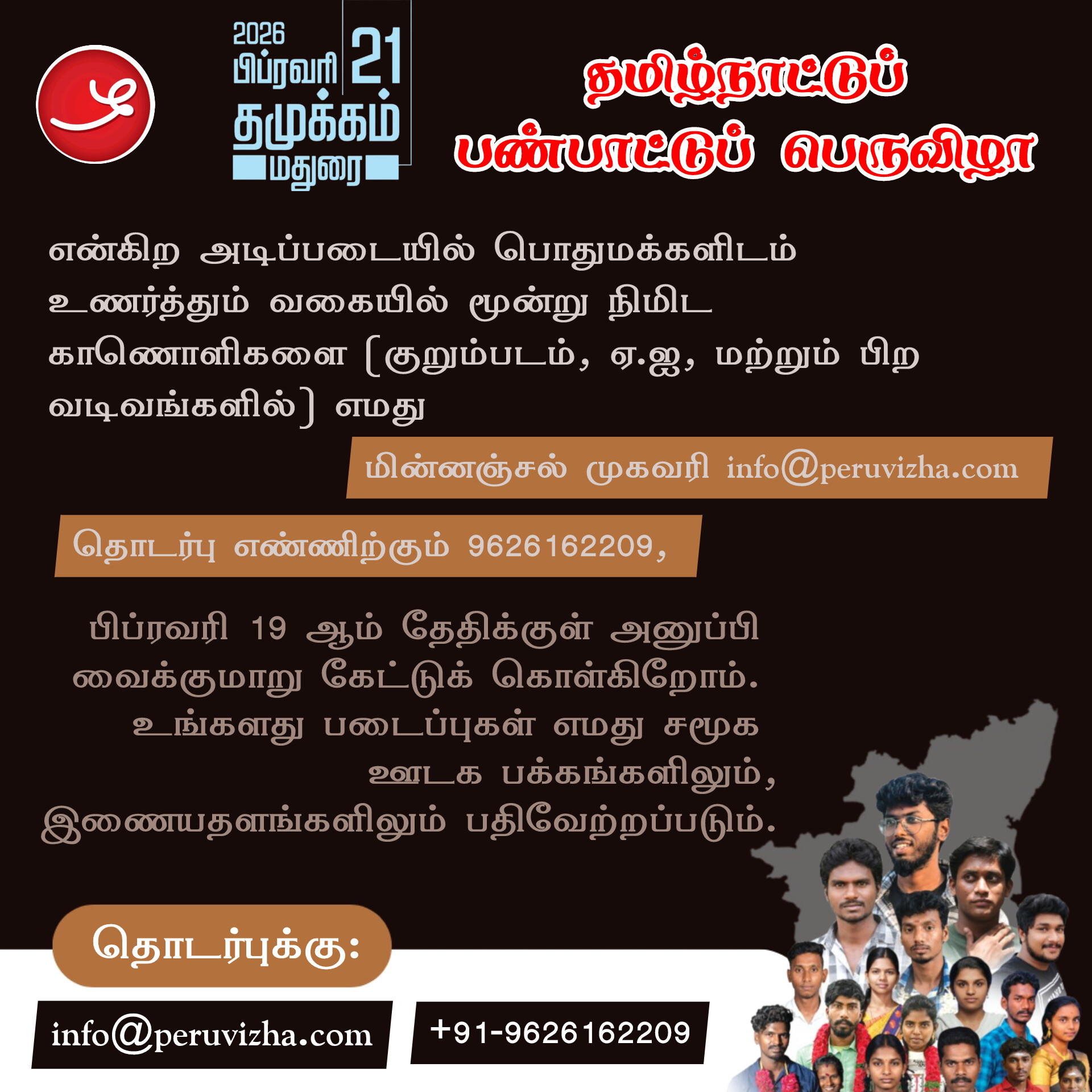 என்கிற அடிப்படையில் பொதுமக்களிடம் உணர்த்தும் வகையில் மூன்று நிமிட காணொளிகளை (குறும்படம், ஏ.ஐ, மற்றும் பிற வடிவங்களில்) எமது மின்னஞ்சல் முகவரிக்கும் info@peruvizha.com, தொடர்பு எண்ணிற்கும் 9626162209, பிப்ரவரி 19 ஆம் தேதிக்குள் அனுப்பி வைக்குமாறு கேட்டுக் கொள்கிறோம். தமது படைப்புகள் எமது சமூக ஊடக பக்கங்களிலும் இணையதளங்களிலும் பதிவேற்றப்படும்.